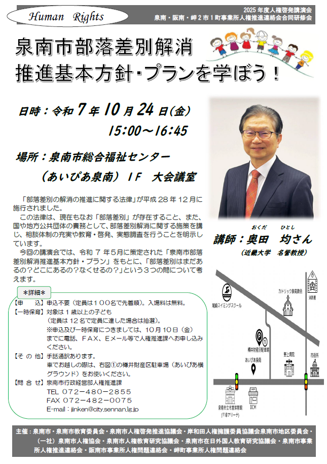 今回の講演会では、2025年5月に策定された「泉南市部落差別解消推進基本方針・プラン」をもとに、「部落差別はまだあるの?どこにあるの?なくせるの?」という3つの問について考えます。