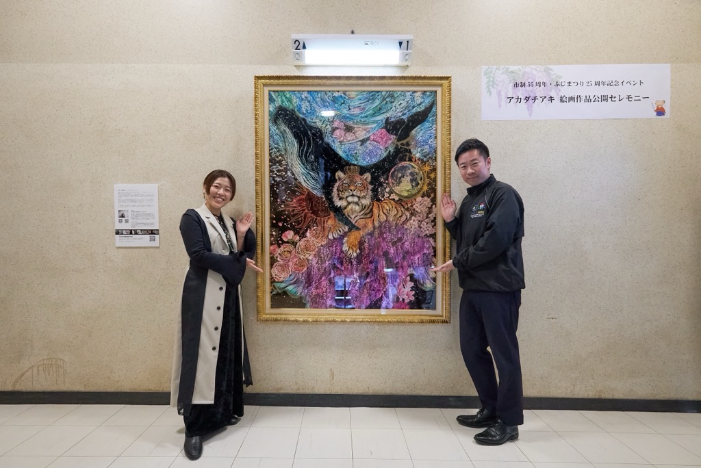 本作品は、令和7年4月に開催したアカダチアキさんプロデュースによる「ふじまつりプラス+」をきっかけに制作が始まり、約9か月の制作期間を経て完成しました。作品は本庁正面玄関1階の踊り場にて常設展示を開始しており、どなたでもご覧いただけます。まだご覧になられていない方は、ぜひ一度ご鑑賞ください。