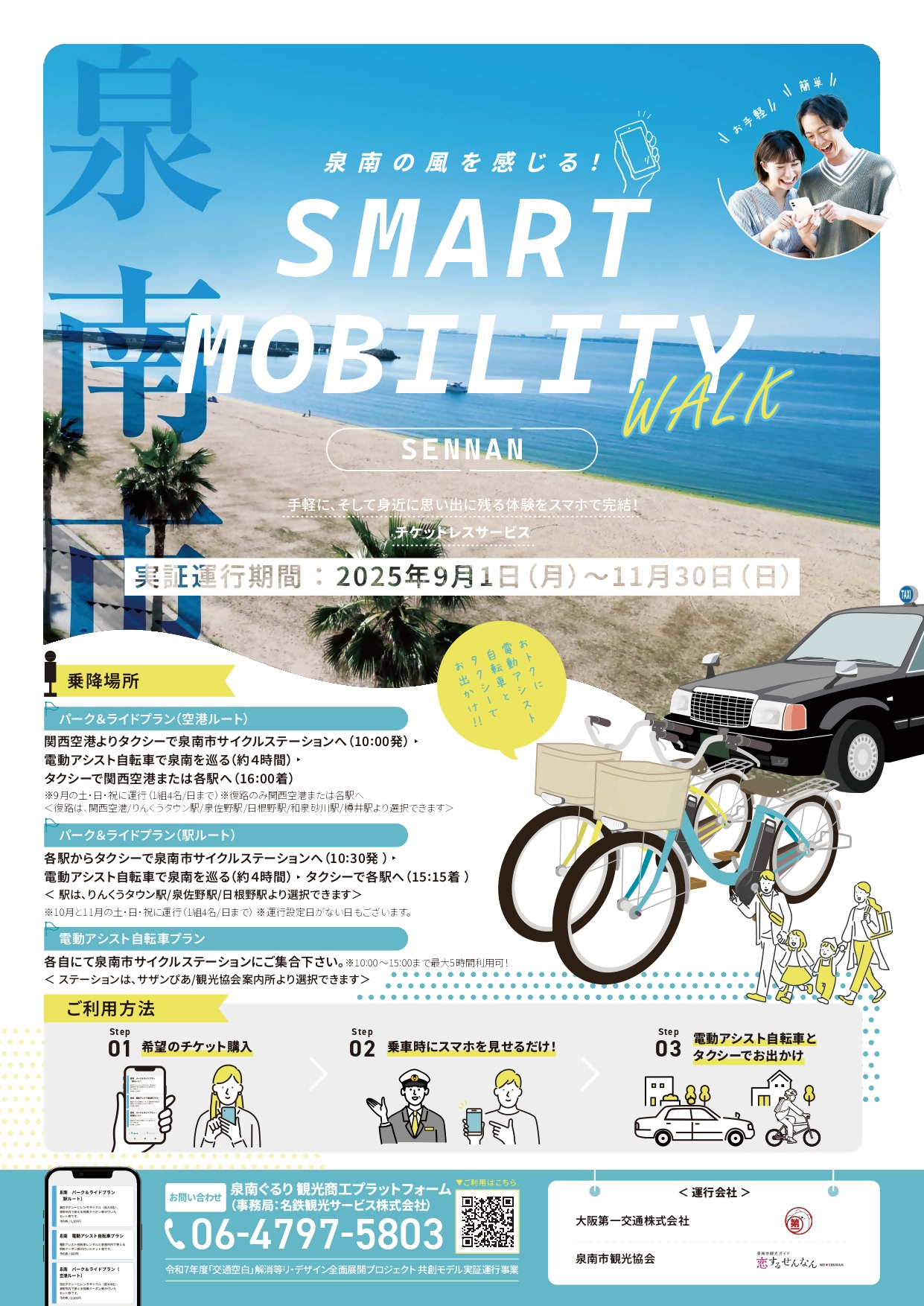 泉南市では、泉南市観光協会・泉南市商工会・阪南大学・大阪第一交通株式会社と共に、泉南ぐるり観光商工プラットフォームを立ち上げ、新しい観光交通サービス「SENNAN SMART MOBILITY」に関する実証実験を実施しています!
