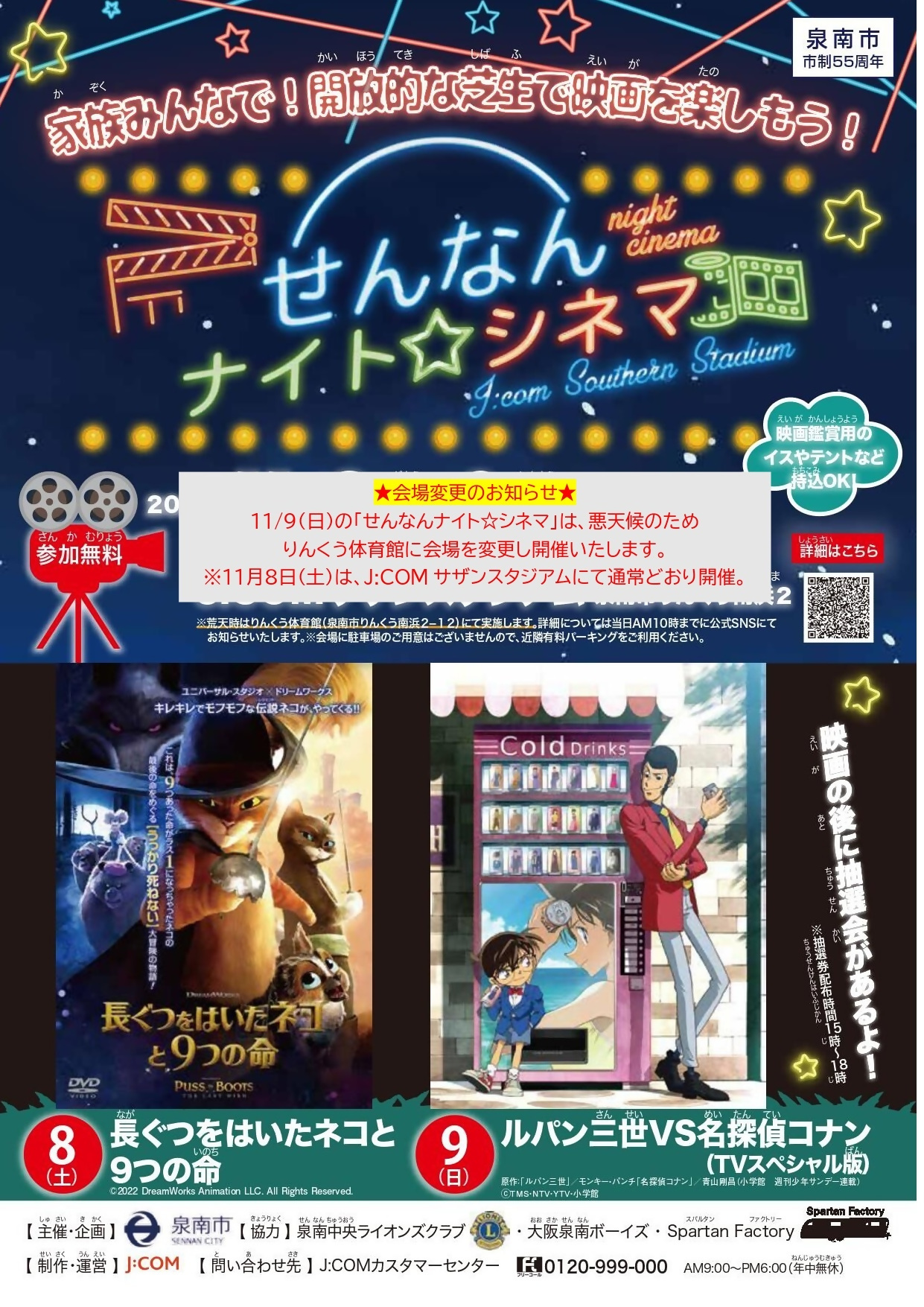 2025年11月9日(日曜日)に予定しておりました、「せんなんナイト☆シネマ」については悪天候が予想されるため、以下のとおり会場を変更して開催いたします。
